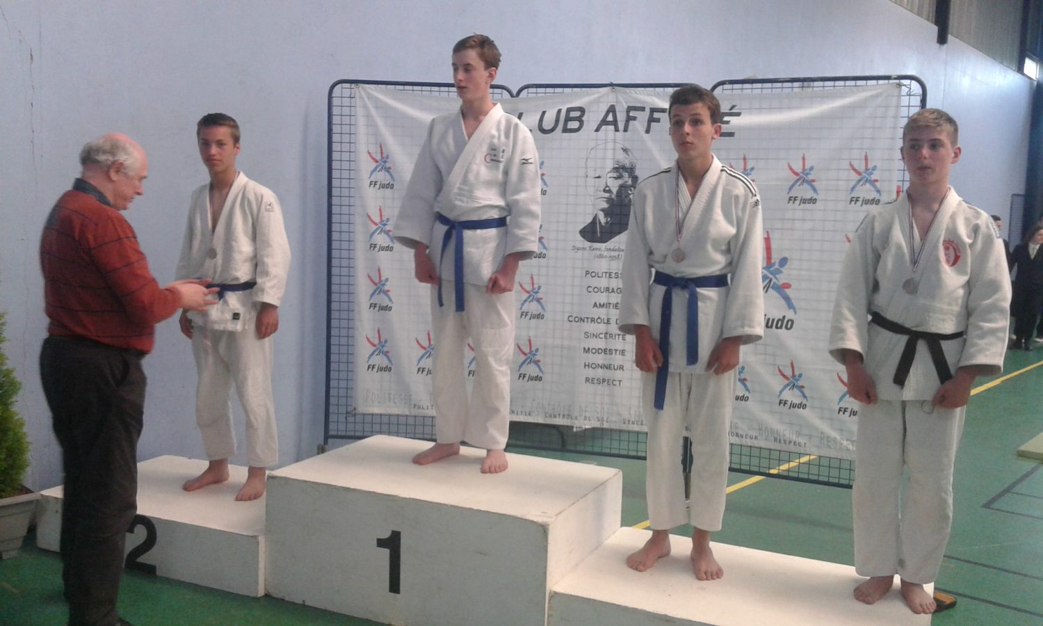 Les 4 Titres chez les garçons: -46kg Evan Leclerc, -50Luke Jaouen (troisième l’an dernier),-55 Steven Rio (sixième l’an dernier), -66 Valentin Lucas