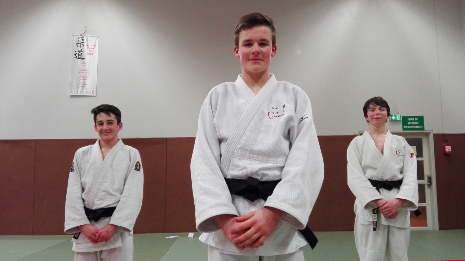 Ce vendredi 4 mars 2016, à la fin du cinquième entraînement de masse du Dojo de Cornouaille , comptant beaucoup de ceintures noires, le Concarnois Sylvain Le Bec, le Quimperois Amaury Cerisier, et le Ergue Gabericois Philippe Morel, se voyaient remettre le grade tant attendu de ceinture noire 1er dan.